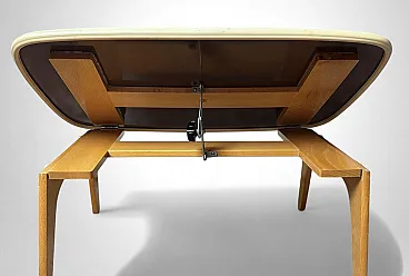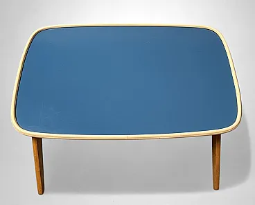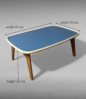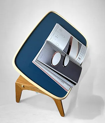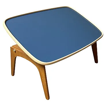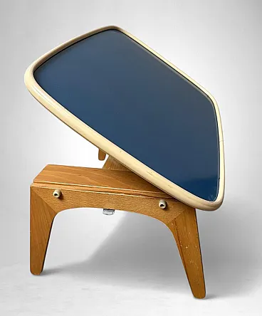 Rare and refined adjustable bed tray produced in the 1950s by Fratelli Reguitti, a renowned Italian manufacturer celebrated for its fine wood craftsmanship and for creating elegant, functional objects that were widely exported. Founded in Seregno, near Milan, in 1929, Fratelli Reguitti became widely known during the mid-20th century for its refined wooden accessories and innovative household objects. The company gained international recognition thanks to its collaborations with designers and its export-oriented production, offering functional pieces that combined traditional Italian craftsmanship with modern design. The tray is crafted from solid beechwood, with folding legs and a precisely built structure featuring smooth joints and clean lines that reflect the artisanal quality typical of Reguitti’s production. The surface is covered in petrol blue Formica, bordered by a molded ivory-tone plastic frame that highlights the tray’s distinctive, softly organic silhouette.The adjustable mechanism, located underneath, allows the tray to be tilted to different angles. This ingenious feature makes it ideal not only for breakfast in bed but also as a support for reading, writing, or using a laptop. A screw-lock system ensures stability and safety during use.A perfect balance of function and Italian mid-century design, this tray captures the optimism of the postwar period and the elegant organic lines that defined the 1950s. It is a versatile and decorative piece that can enrich a bedroom or living room, blending seamlessly into mid-century, Scandinavian, or contemporary interiors. Both a collectible design object and a practical everyday accessory, this tray is an authentic expression of Italian craftsmanship and Reguitti’s attention to detail. The object is in good condition. Dimensions: Width: 60 cm (23.6 in) Depth: 39 cm (15.3 in) Height: 7 cm (2.7 in)