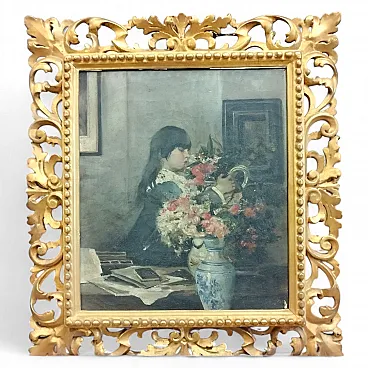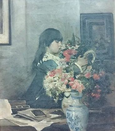 A masterpiece of late Italian Romanticism, this oil on canvas painting by Alessandro Rontini is a work of rare beauty. Titled 'Little Girl in an Interior and Flowers', the painting portrays a young girl with a sweet and melancholy expression, typical of the artist's style. The handwritten signature at the bottom right attests to its authenticity. The painting technique, characterized by delicate brushstrokes and a soft light, creates an intimate and evocative atmosphere. A work that captures the spirit of the era and lends itself to different interpretations.