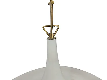 This combination not only makes the piece visually sculptural, but also ensures that the diffused light is soft and welcoming. The burnished brass suspension details add a touch of refinement and highlight its quality craftsmanship and its authentic vintage value.
