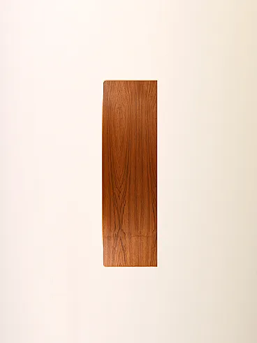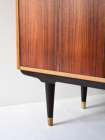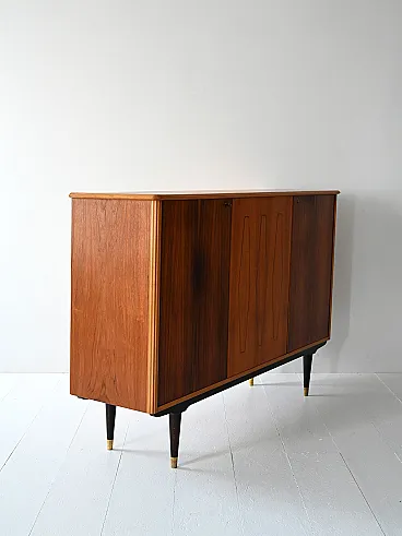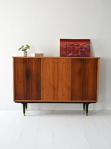 Tall 1950s cabinet with graphic veins, contrasting inserts and elegant brass details. Nordic mid-century style.