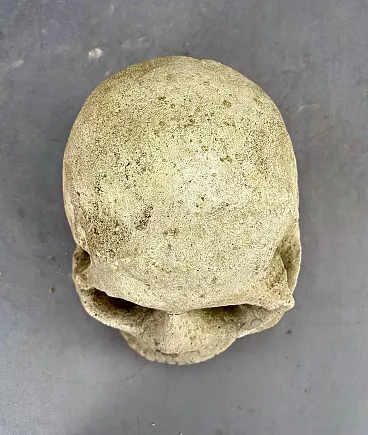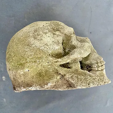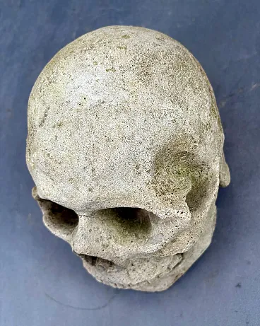 An extremely rare and original French Gothic skull sculpture dating back to the 18th century. This large relic was recovered from a destroyed church in the Somme Valley, France. Handcrafted from stoneware, the sculpture depicts a horrifying skull, with a grotesque expression and incredible detail. A true relic of Gothic horror art and medieval architecture.