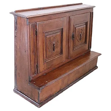 We are offering this antique Italian kneeler dating from the first quarter of the 18th century at an exceptional price. Crafted from solid walnut, this kneeler is larger than traditional bedroom kneelers, with two paneled doors and a delicate central decoration. Inside, it features a practical shelf and a large space for storing sacred texts. Another compartment is available on the platform where you kneel for prayer. Coming from a previous private owner, it is in excellent condition, probably restored.