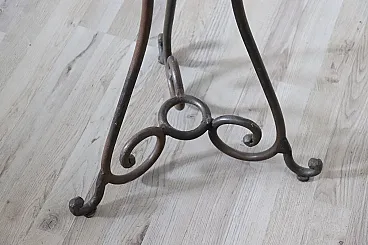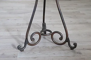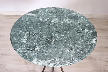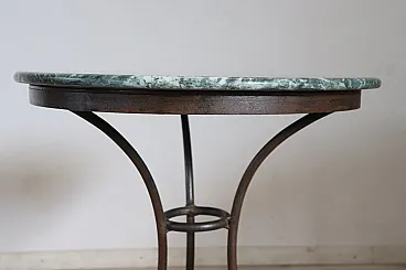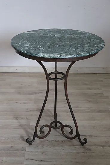 It features a round shape with sturdy and elegantly curved iron legs. The top is made of refined green marble.