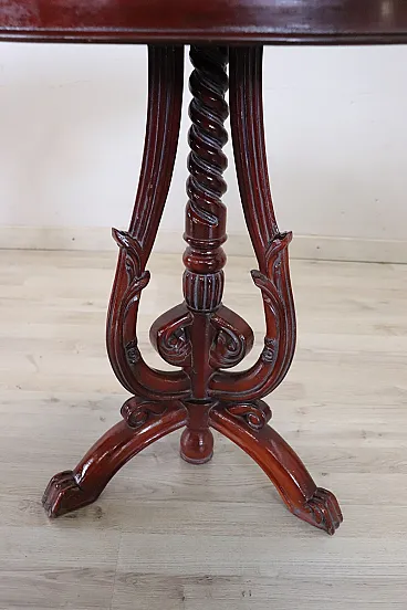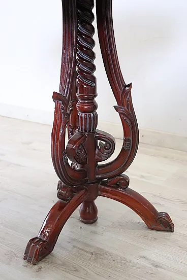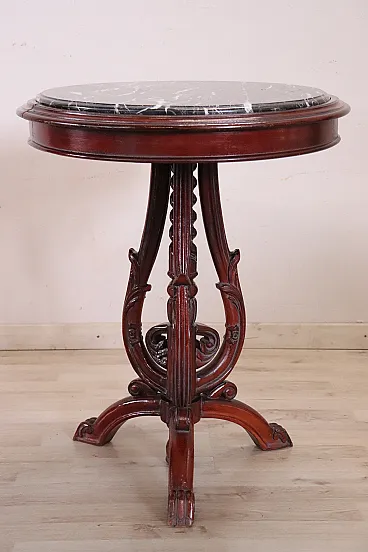 It has a round shape with a beech wood structure and a refined dark gray marble top. The legs feature an elaborate, classically carved wooden decoration.