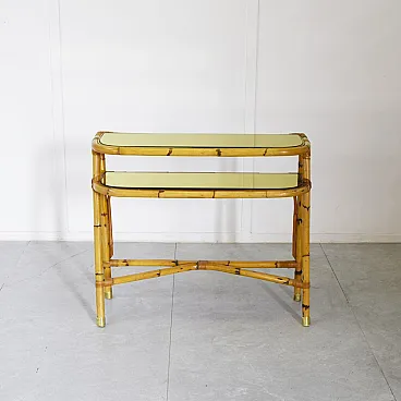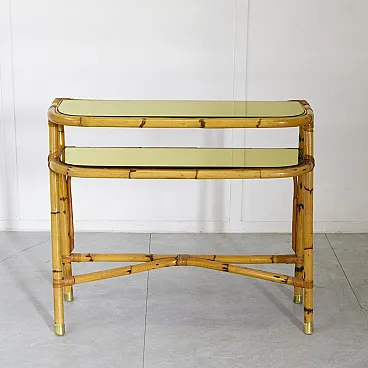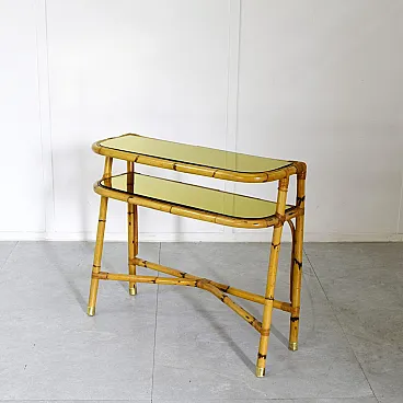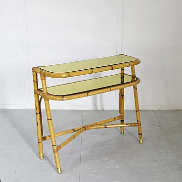 This vintage double-tiered console table perfectly embodies Midcentury Modern style with Hollywood Regency influences. The supporting structure is crafted from genuine, curved and tied natural bamboo, typical of Italian production from the 1950s and 1960s, displaying its characteristic patina. The two shelves are made of pale gold/champagne mirrored glass, a detail that lends an immediate touch of luxury and warm reflections. The finishing details, particularly the foot caps, are crafted from polished brass, adding a refined contrast to the natural material. The open construction, reinforced by a central crosspiece, makes it ideal as an accent piece or entryway piece in sophisticated settings.