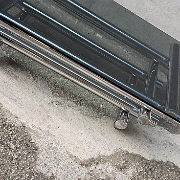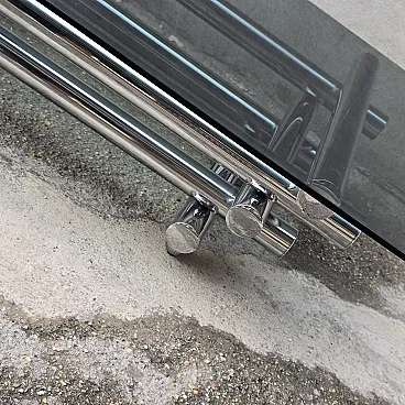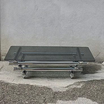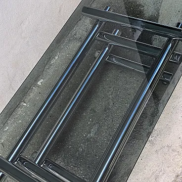 Modern Italian coffee table recalls the style of Willy Rizzo. In glass and chromed steel, 1970s rectangular with smoked glass top and multilevel tubular base made up of several intertwining tubes in chromed steel. Chromed ball feet Good condition, with some superficial oxidation on the metal. Very particular coffee table, with shapes and materials typical of 70s design. Given the materials, the coffee table adapts perfectly to different styles, from a more vintage style but can also be combined with modern and contemporary furniture. It will stand out giving a vintage look to your home