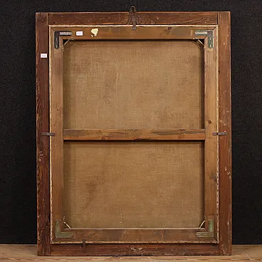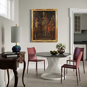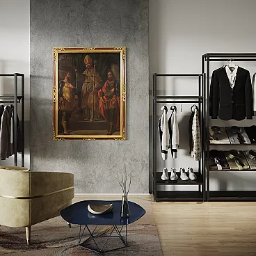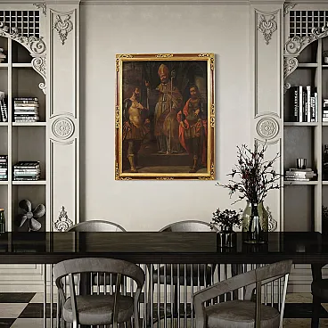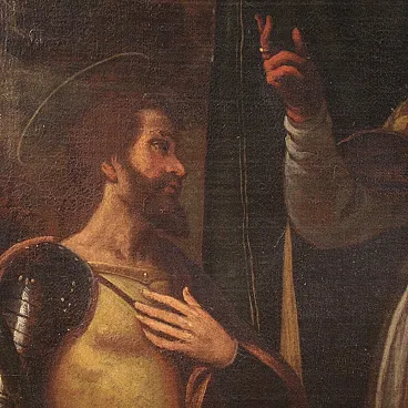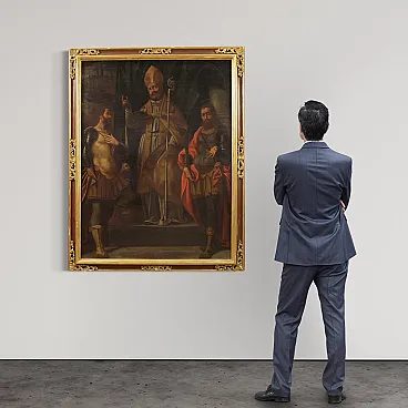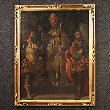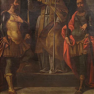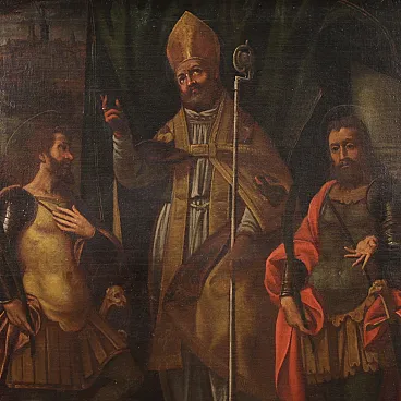Ancient religious painting from the 17th century. Oil work on canvas depicting a trinity of soldiers of the faith, Fermo, Proloco and Rustico, saints much loved in the Lombard tradition. In the center, San Proloco in episcopal robes imparts the blessing to the two warrior saints who flank him, in a pyramidal structure of great balance and symbolic strength that refers to the Lombard school. In the background, behind a splendid curtain, we glimpse a city, probably Bergamo or Brescia. A work of notable pictorial quality which stands out for the intense rendering of the faces, the preciousness of the drapery and the details of the clothes. Perfect painting for collectors of high-era sacred art, capable of ennobling classic or modern environments with elegance and solemnity. Spectacular 20th century frame in carved, gilded and lacquered wood, with some signs of aging. Work already restored with relining, replacement of the frame and color recovery in small spots. Overall in good state of conservation. Light painting H 116 x W 89 cm.