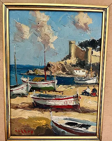 Oil painting, seascape impressionist boats, 20th Century