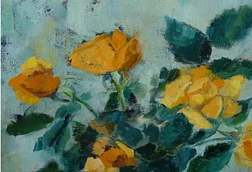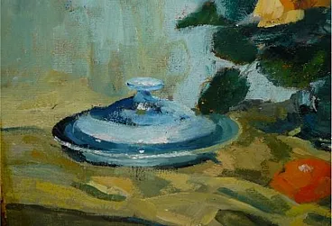 Still life oil painting bouquet of flowers and fruits, 20th century