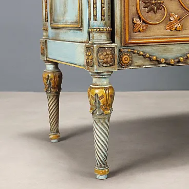 Neoclassical chest of drawers. The front of the two drawers is richly carved with grape vines, the sides are turned, and the feet are carved in a truncated cone shape. The handles are wrought bronze, the top is white marble. Italy, 20th century.