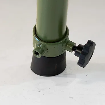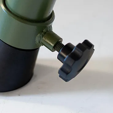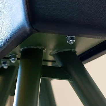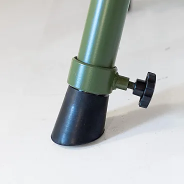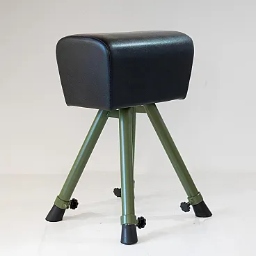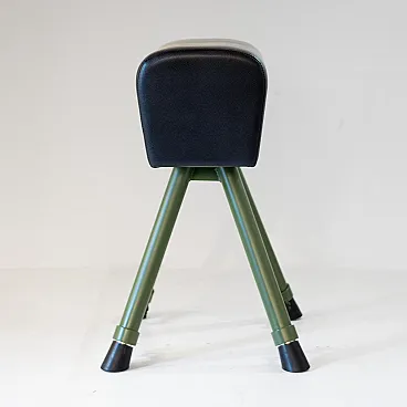Professionally restored and ready for use, the structure features a tubular metal frame repainted green, equipped with metal legs. Original cover surface in high quality black eco-leather.