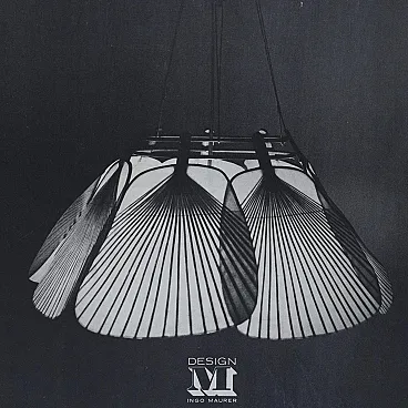 This is truly a collector's item. Even though it was made in the 1970s, this lamp still has its original box. It was only taken out for taking pictures. Ceiling lamp designed by Ingo Maurer (1932-2019) for Design M, Munich, known as the SHICHI model from the “Uchiwa” series, crafted in 1973. Constructed with a wooden frame holding seven overlapping leaf-shaped fans made of bamboo and beige-colored rice paper, secured with brass clamps. Features an adjustable holder composed of cords, internally equipped with a socket and lamp holder made from bamboo tubes. Assembled Dimensions: Height: Approximately 120 cm (adjustable). Diameter: Approximately 55 cm. Condition: Shows minimal signs of aging, evident in detailed photos. The cardboard box exhibits wear from storage.