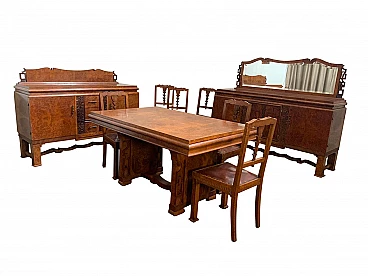 Art Deco living room set composed by 2 sideboards, one with mirror and one with riser. Table and 6 chairs. The sideboard with mirror includes 3 large doors, the central part finely carved. The second with riser includes 2 doors and chest of drawers in the center with carved edges. Table with base with carved edges, the table can be extended (extensions are not available) and six chairs with carved back. All in selection tuja burl, the exquisitely Art Deco carvings are in the style of Ettore Zaccheri. Measures sideboard with mirror h185, only sideboard h99x185x52, mirror h55; sideboard with riser h122, only sideboard h90x160x52; table h79x95x154; chair h96x45x43, seat h45. The furniture is in good condition and functional ready to be placed.