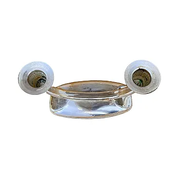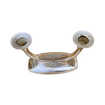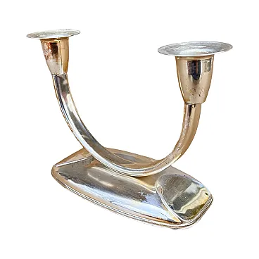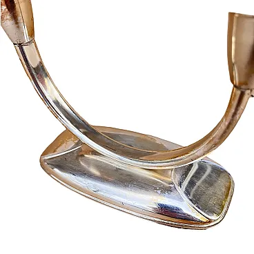 A subtle, two-armed, plated candlestick from the 1960s. The arms are decorated with simple fluting and are visually set wide apart, giving the whole thing a delicate touch, additionally placing an ellipse-shaped nodus under them. The profitti are shaped prominently, with concave-convex fluting all around. Plating is a process in which thin layers of a more precious metal, usually silver or gold, are applied to a less noble metal. This is a method known and used for centuries to decorate and refine all utility items, giving them corrosion-preventing, surface hardening, and bactericidal properties. Such a finish ensures increased durability, shine, and timelessness of the item.