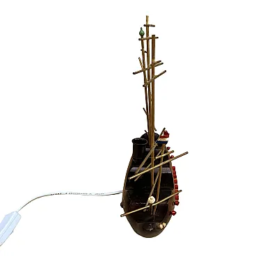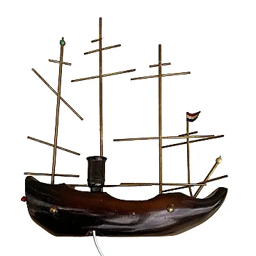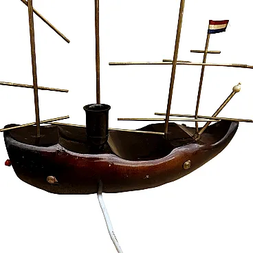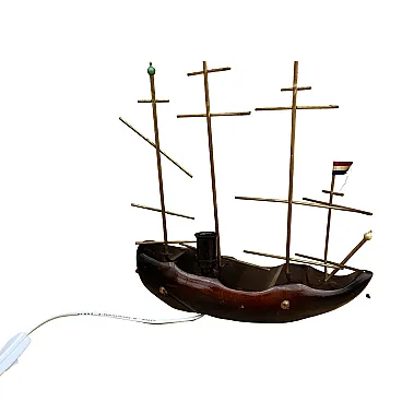 A wonderful old figurative table lamp in the shape of the Mayflower, the wooden sailing ship that brought the Pilgrims to America in 1620, made in Holland in the 1950s - and still works great. This sailing ship lamp is made of solid wood with metal masts and crossbeams and cord rigging.