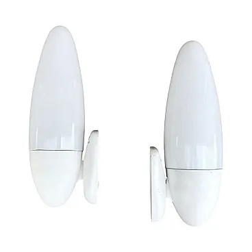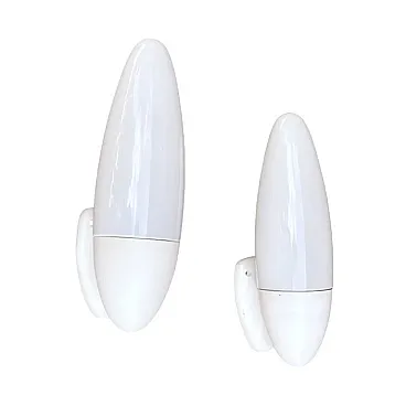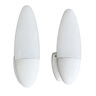 A pair of wall lamps type 13702 manufactured in Czechoslovakia in the mid-20th century for Elektrosvit Nové Zámky. A lamp with a lampshade made of whitened glass mounted on a bakelite base. The item is in the Brussels style with industrial elements. The lamp works on a single E27 bulb up to 60W. Lamps in good condition, the lampshades are intact, slight discoloration is visible on the bakelite bases. Beautiful items from the mid-20th century, a classic of the early space age style. Price per pair.