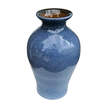 This elegant vintage ceramic vase from the 1960s/1970s is made using a reactive glaze technique in a unique, intense shade of navy blue with subtle white dots resembling a "snow" effect on the surface. The style and finishing technique suggest a possible West German production style or a reference to the design popular in West Germany during the Mid-Century Modern period.