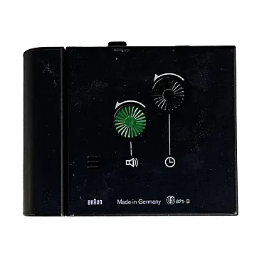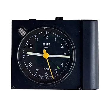 This BCS model, from the late 1980s or early 1990s, features a quartz movement. The distinctive hands – a white hour hand, a yellow seconds hand, and a light green alarm indicator – are hallmarks of Dieter Rams's designs.