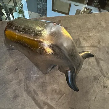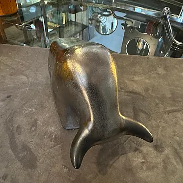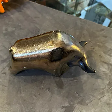 This Ceramic Bull by Otto Keramik is a striking and unique piece of ceramic art that epitomizes the design aesthetics of the era. Created by the renowned German pottery studio Otto Keramik, this sculpture showcases the boldness and creativity that defined the Modernist movement of the 1970s. The bull sculpture is crafted from high-quality ceramic, which provides a solid and substantial base for the artwork. The use of ceramic allows the application of vibrant yellow glaze, which contribute to its distinctive appearance. The sculpture's dominant color is a vibrant glazed grey with black accents, which was a favored hue in many Modernist designs. This bold shade adds a sense of energy and dynamism to the piece, making it a visually striking focal point. The glaze is applied in a way that creates variations in tone and texture, adding depth and visual interest to the sculpture. The bull itself is designed with a modernist sensibility, featuring simplified and geometric forms. The lines are clean and streamlined, emphasizing the sculptural qualities of the piece.