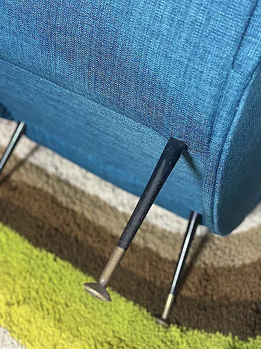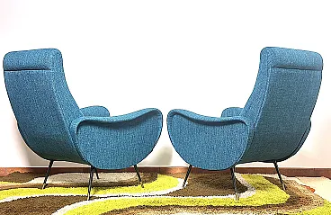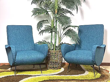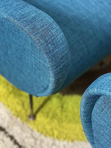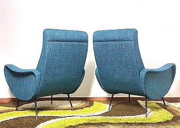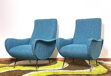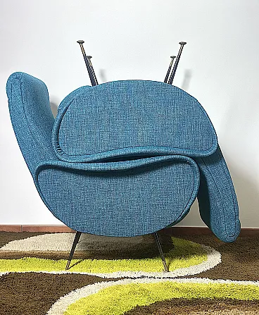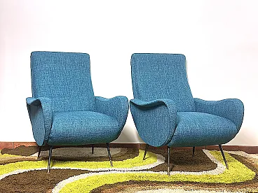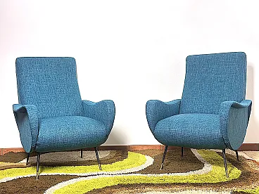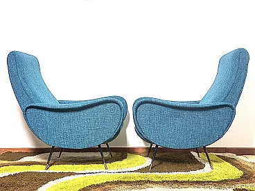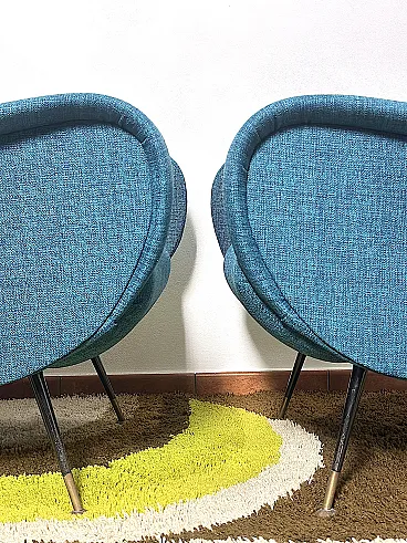 Pair of "LADY" armchairs from the 1950s. Design attributed to MARCO ZANUSO, a masterpiece of Made in Italy. Lady was awarded the Gold Medal at the IX Triennale of Milan in 1951. The armchairs are of Italian manufacture, completely restored with new upholstery and interiors, Melange fabric in Light Blue colour, unmistakable style of the shell by designer Marco ZANUSO, feet in brass with typical design of the 50s. PERFECT CONDITIONS Measurements Height 90 cm/Width 64 cm/Depth 90 cm/Seat height 40 cm/Seat 50 cm