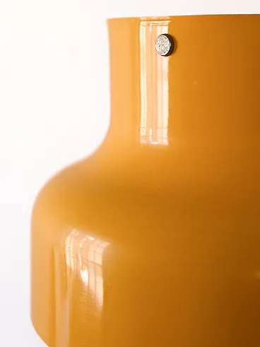Iconic Bumling ceiling lamp designed by Anders Pehrson for Ateljé Lyktan in the 1960s. Version in yellow lacquered metal, characterized by its soft and recognizable design and the original louvre that diffuses a warm and uniform light.