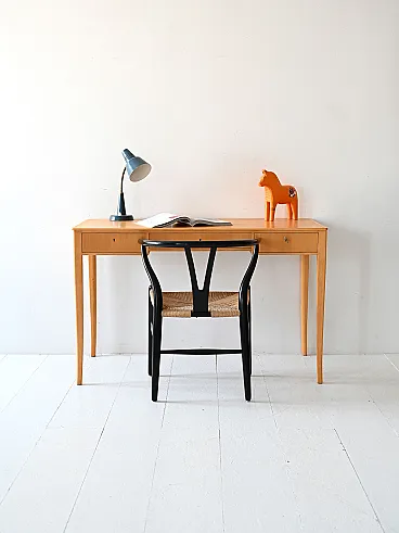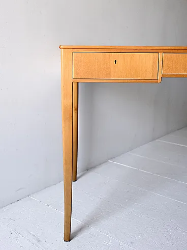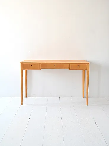 Vintage desk in light birch designed by Carl Malmsten for Åfors, with three front drawers and tapered legs. Rare model from the master of Swedish design, with original manufacturer's stamp. Swedish desk in light birch designed by Carl Malmsten for Åfors around the mid-1940s. Made of solid wood with a natural finish, it features three front drawers with original locks and tapered legs that give lightness to the structure. On the back of one of the drawers there is the original manufacturer's stamp. The balanced proportions and sober line reflect Malmsten's philosophy, oriented towards a functional but refined aesthetic. Rare designer model, example of the best Scandinavian craftsmanship of the period. Good condition. It may show some signs of aging. Please pay attention to the photographs.