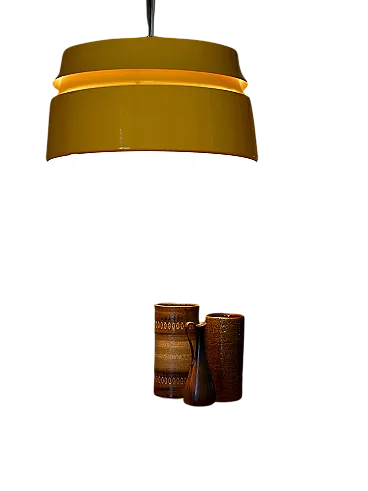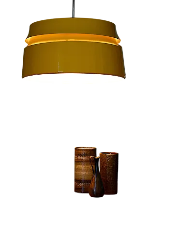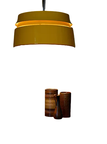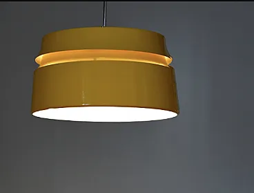 Elegant Scandinavian ceiling lamp in yellow lacquered metal with white interior, made in the 1960s/70s. Its design stands out for the structure of two overlapping cylinders, which creates a pleasant play of lights and reflections, giving it a sober but at the same time dynamic character.