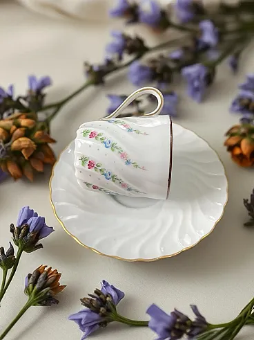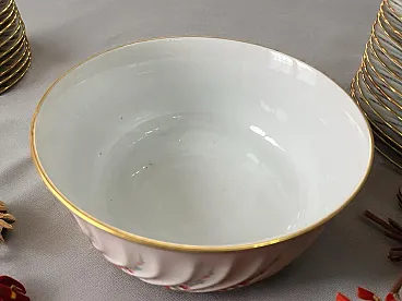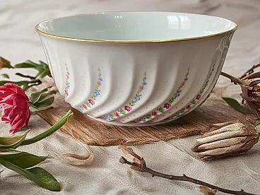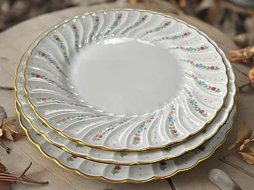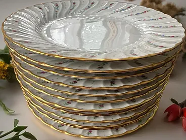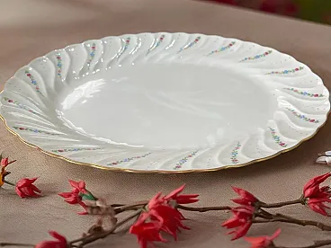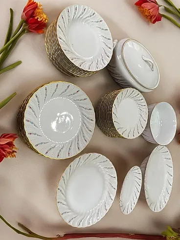 Richard Ginori porcelain tableware set with golden edge. They feature a raised spiral texture decorated with green, purple, blue and pink floral motifs. The set includes - 1 round serving plate - diameter 30.5 cm, weight 1 Kg - 1 oval serving plate - L 37.5 X 26.5 cm L, weight 1.3 Kg - 1 serving plate oval - W 24 cm X 14 cm L, weight 350 g - 1 salad bowl - H 10 cm X diameter 23 cm, weight 1.2 Kg - 1 bowl - H 13 cm X W 27.5 X 17 cm L, weight 1.9 Kg - 12 dinner plates - diameter 25 cm, weight 450 g - 12 soup plates - diameter 23 cm, weight 400 g - 12 appetizer plates : diameter 21.5 cm, weight 350 g - 12 coffee plates - diameter 13 cm, weight 100 g - 12 coffee cups - H 6 cm X 5.5 cm diameter, weight 50 g - 1 coffee maker : H 22 cm X 7 cm diameter, weight 500 g - 1 sugar bowl : H 12 cm X 6.5 diameter, weight 170 g - 1 milk jug : H 11.5 cm X 7.5 cm diameter, weight 150 g