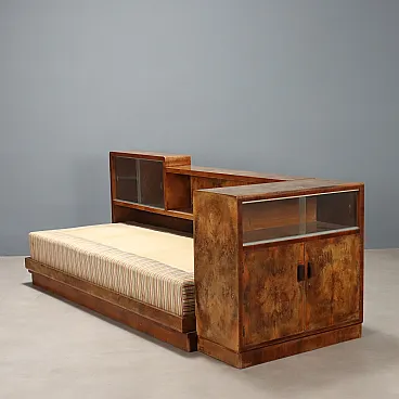Art Deco bed with sprung padding and fabric upholstery, wooden frame with burl veneer, containers on two sides with open compartments, display cabinets and hinged doors.