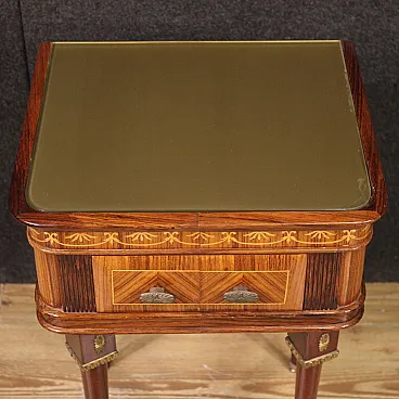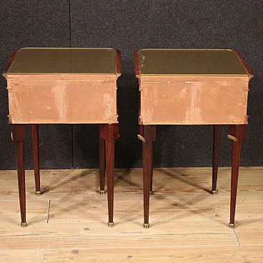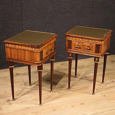 Pair of Italian bedside tables from the 1960s. Furniture with beautiful lines and proportions veneered in walnut, maple, beech and fruit wood. Bedside tables equipped with a drawer and an upper support surface in gilded glass (gilding of the glass with some small loss of color, see photo), without chips, of good service.