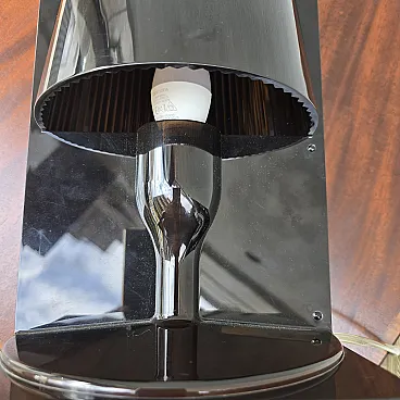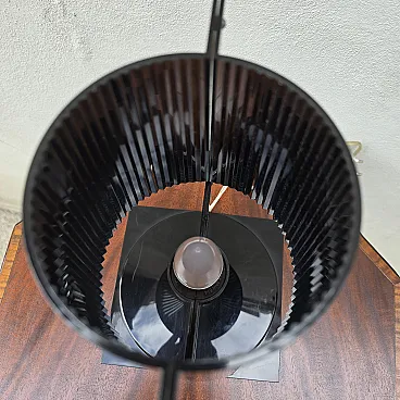 Emblematic lamp from the Kartell house, Take model, designed by Ferruccio Laviani. Made through an injection process of two flat, rectangular sheets of polycarbonate which become two-dimensional. The final product is therefore the union of two symmetrical parts that take on the shape and volume of the lamp. The inner surface of the screen is pleated to illuminate more interestingly. It is very light and easy to move, plus the matt black/brown polycarbonate makes it very elegant. It is a design icon, perfect for any environment, whether as a bedside lamp, or as a desk light, or in a corridor. The company seal and its name, "TAKE", appear in the lower area of the base.