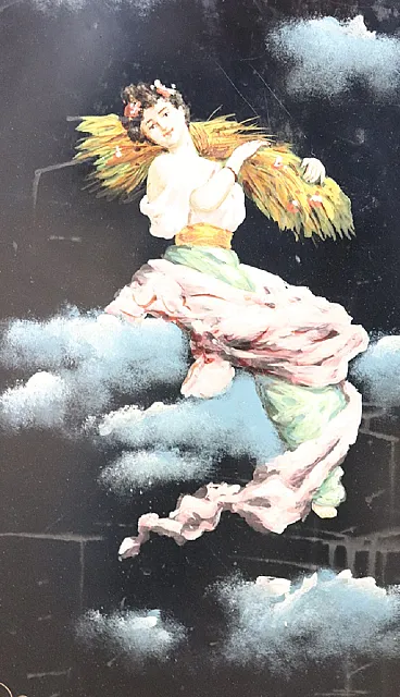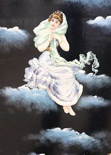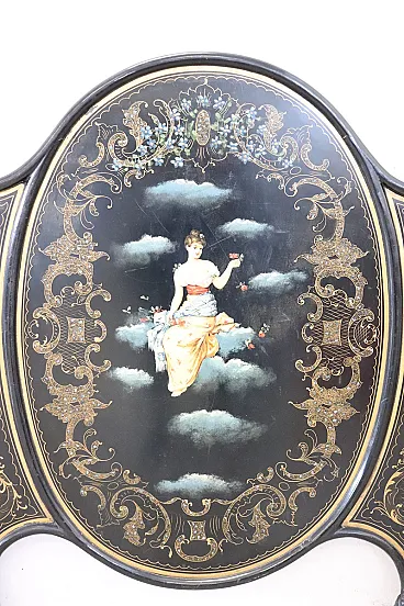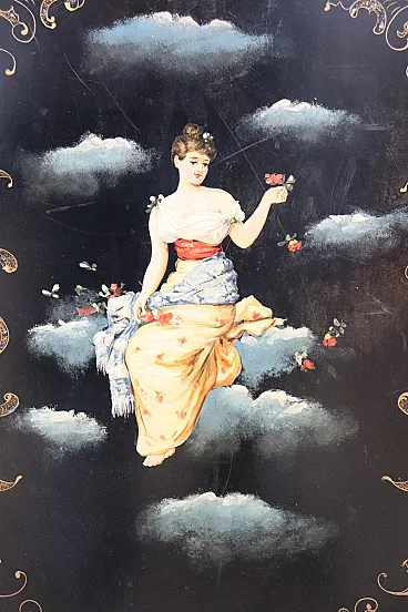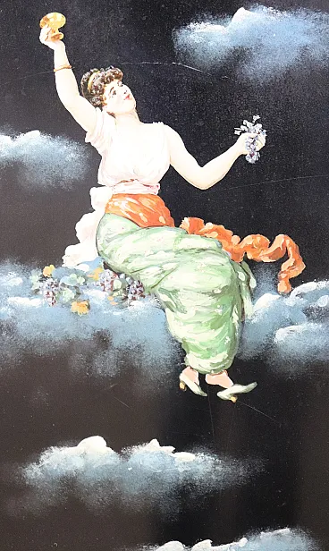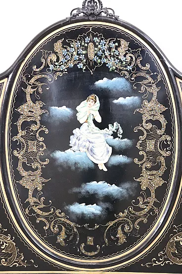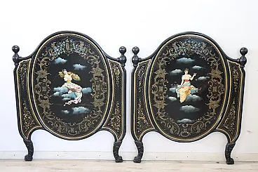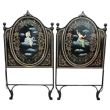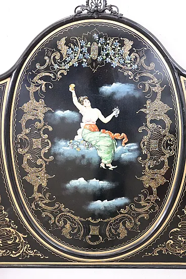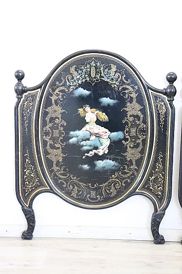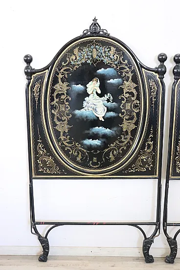 The beds have a black iron structure. The elaborate and refined hand-painted decoration, which creates a distinctive visual accent on the headboard and footboard, is sure to catch your attention. In the center of the oval, framed by curls and golden scrolls, there is a young woman with different characteristics for each piece, a fantastic allegorical representation of the four seasons.