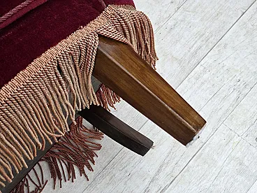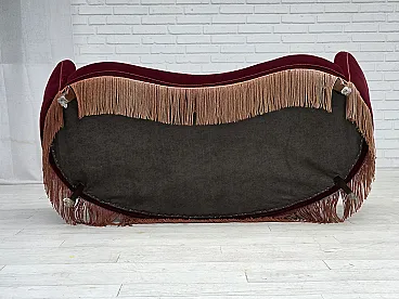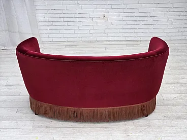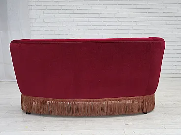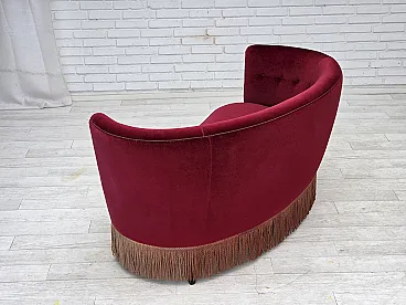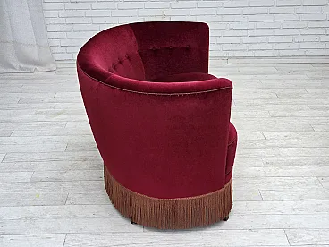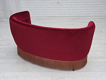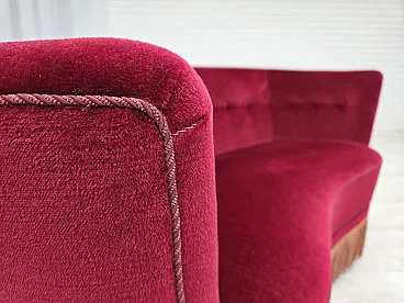 Danish 2-seater curved sofa, red velour, beech wood, 1970s
