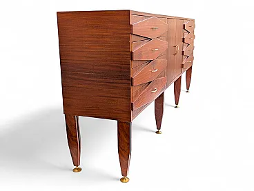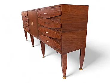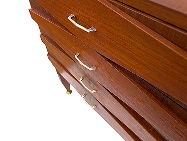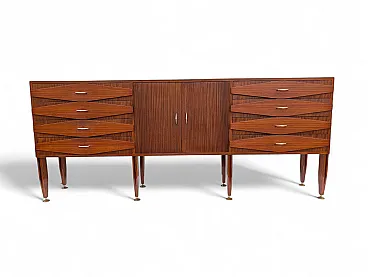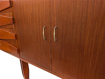 The entire structure is supported by a series of tapered legs, typical of the design of the time, which streamline the silhouette and lift it gracefully from the ground. The leg ends are finished with brass feet. This piece, thanks to its teak design and original diamond workmanship, is a distinctive example of period craftsmanship that combines functionality and strong aesthetic impact.
