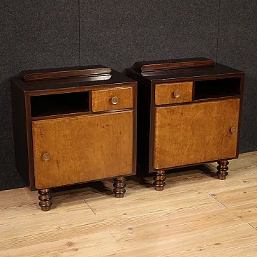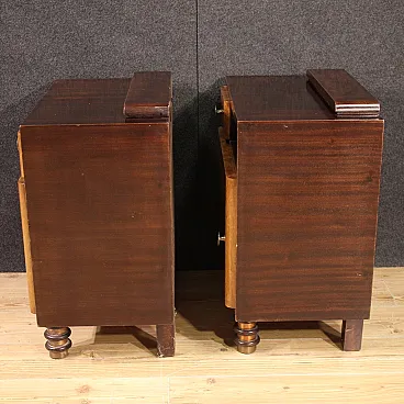 Pair of Italian bedside tables from the 60s/70s. Furniture carved and veneered in mahogany, briar and fruit wood of fabulous design and excellent service. Bedside tables equipped with a drawer, an open compartment and a large-capacity door. Wooden upper surface in character adorned with a rounded splashback (see photo).