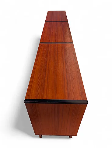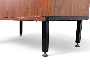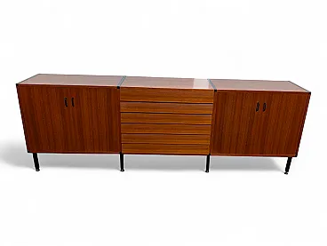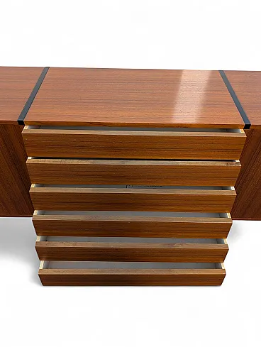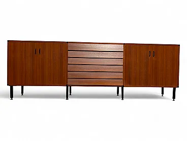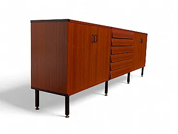 This teak wood sideboard, typical of the Mid-Century Modern design of the 1950s, features a long horizontal structure. The cabinet is divided into three sections: in the center there are six drawers with a front with horizontal slats. On the sides, the cabinet is closed by hinged doors, equipped with black handles, which hide compartments with internal shelves. The entire structure rests on slender black metal legs, joined by a dark frame, giving it a light and airy appearance. The design is defined by elegant functionality and clean lines, with a pleasant contrast between the wood and black elements.