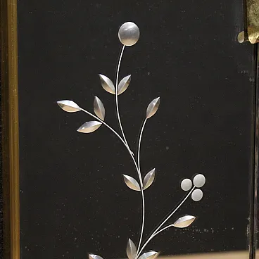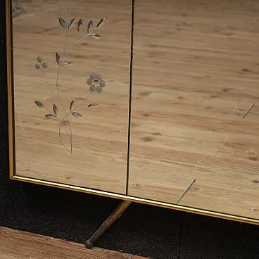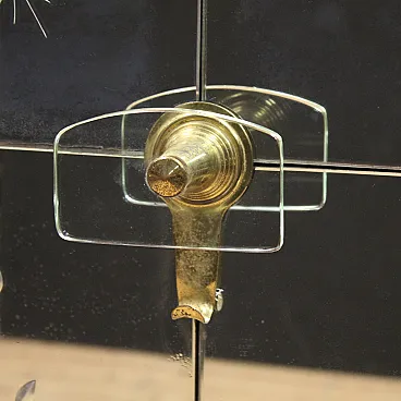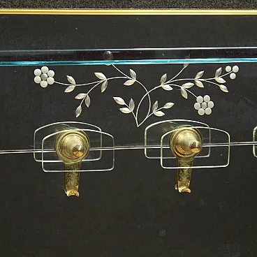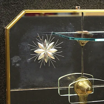 Mid 20th century Italian mirrored coat rack. Furniture of exceptional quality of Italian design with inlaid mirrors and golden brass decorations. Coat stand equipped with 4 crystal elements for attaching clothes and glass hat rack (see photo). Feet and side frame in golden brass. Ideal piece of furniture for an entrance or study, with fabulous furnishings, to be fixed to the wall using two simple screws in the upper part. Without breaks or chips, it has a beautiful patina and is in a good state of conservation.