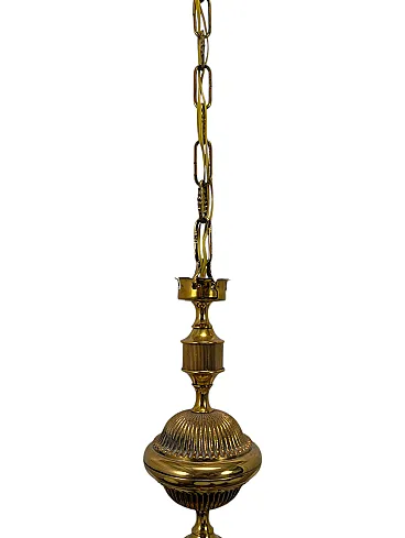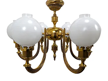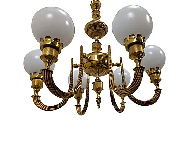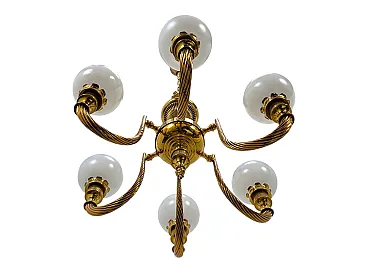 This stunning pendant light, with a design reminiscent of the 1960s, features a polished brass structure that gives it an elegant and timeless appearance. It is equipped with six curved and twisted arms, which support as many spherical diffusers in white opaline glass, for a diffused and welcoming light. The central body and the details are finely crafted. This lighting piece is designed for the use of six E14 socket bulbs.