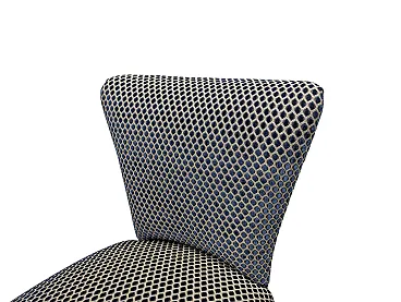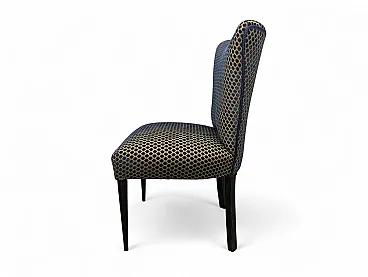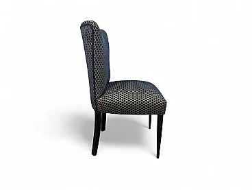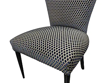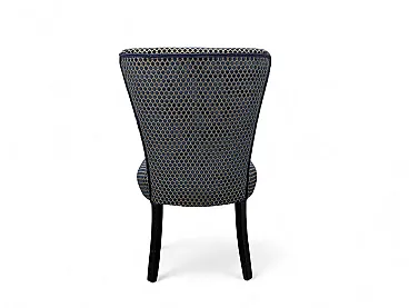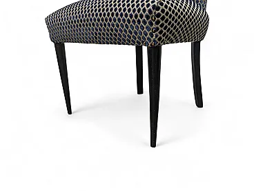 This is a designer armchair covered in velvet in an intense petrol blue or peacock blue colour, a shade that gives it a very elegant and refined look. The seat stands out for its rounded and welcoming shape, with an enveloping backrest that seems to embrace those who sit. The aesthetic peculiarity lies in the "shell" or vertical ribbed workmanship, which creates a fan-shaped effect and gives the armchair a rich visual and tactile texture, typical of revisited Art Deco or mid-century modern inspired design. It rests on a structure made up of four dark-colored wooden legs, which offer a sober contrast and a sense of classic solidity to the piece. Overall, it is a furnishing element that combines the comfort of a padded seat with sophisticated aesthetics, ideal for a living room, a reading corner or a bedroom that wants to stand out.