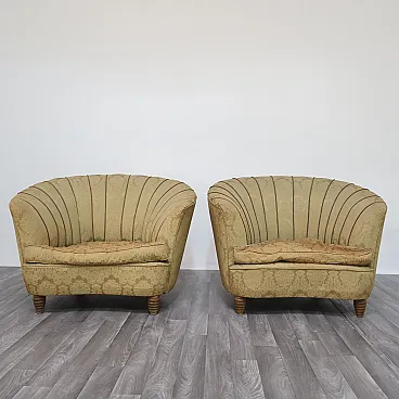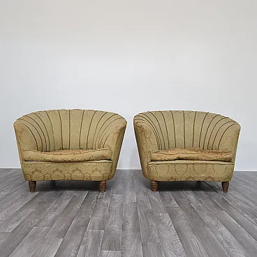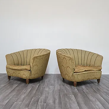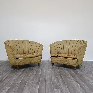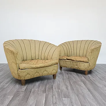 Elegante coppia di poltrone italiane degli anni ’50 attribuibile a Gio Ponti per Casa & Giardino. Il design si distingue per la linea sinuosa dello schienale a conchiglia, con lavorazione a canne verticali che valorizza la silhouette curva e armoniosa. Le gambe tornite in legno massello, dal profilo scultoreo, completano la struttura conferendole solidità e carattere.
