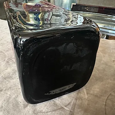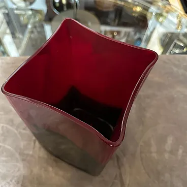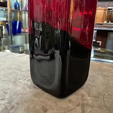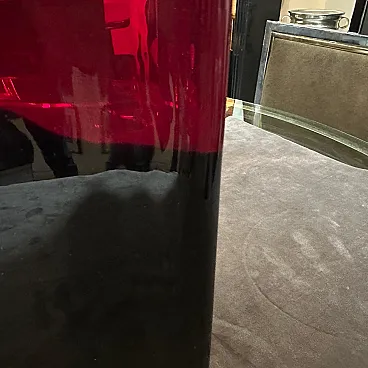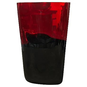 Vintage 1980s Modern Red and Black Murano Glass Vase (Attributed to Carlo Moretti) This striking piece is a sophisticated example of 1980s Italian art glass, with a bold, graphic aesthetic characteristic of designers like Carlo Moretti. The vase features a tall, slightly flared, cylindrical or rectangular silhouette. Its most dramatic feature is the distinct division of color, using the sommerso (submerged) technique. The lower half of the vase is crafted from solid, opaque black glass, which transitions sharply to a vibrant, transparent ruby red glass in the upper half. The clean lines and sharp color blocking highlight a modern, minimalist Italian design sensibility, a departure from more ornate Murano styles. This substantial vase would make an arresting statement on any shelf or tabletop.