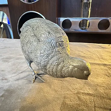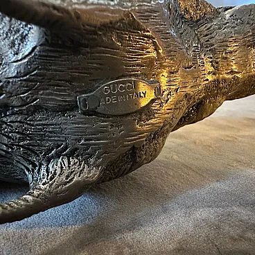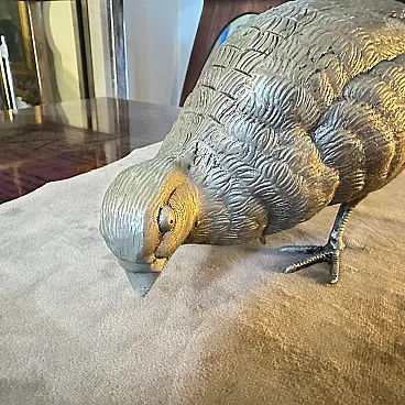 Vintage Gucci Italian Metal Bird Desk Ornament or Paperweight This charming desk accessory is a vintage piece of home décor or paperweight by the renowned Italian luxury house, Gucci. The item is a detailed sculpture of a partridge, captured in a distinctive feeding pose with its head lowered. The entire figure is crafted from metal with a bright silver-plated finish. The texture of the piece is highly detailed, featuring individual feather patterns across the body. A small, recognizable plaque or hallmark is visible on the underside, marked with the words "GUCCI MADE IN ITALY," confirming its designer origin. This elegant, whimsical, and substantial piece is characteristic of the luxury novelty and desk accessories produced by the brand in the 1970s and 1980s.