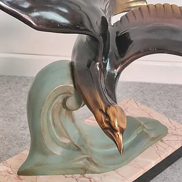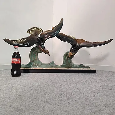 Refined French Art Deco sculpture made in the 1930s, depicting two bronze seagulls gliding elegantly over stylized waves.