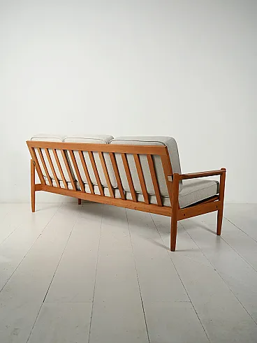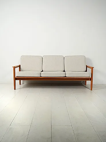 Vintage Scandinavian three-seater sofa in solid oak, with remade and removable cushions.
