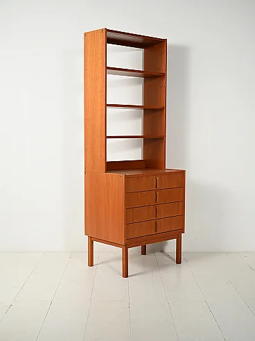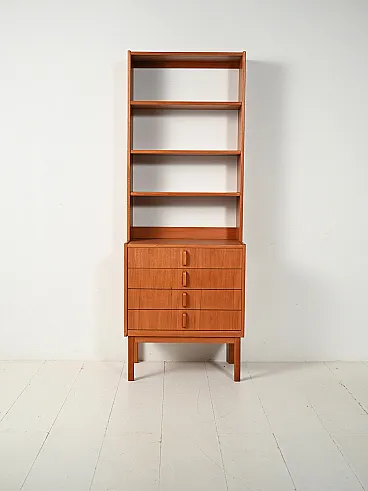 Teak bookcase designed by Bertil Fridhagen for Bodafors, Swedish production from the 1960s. The piece of furniture combines a lower part with a four-drawer chest of drawers equipped with elegant curved teak handles, and an upper part with exposed shelves and an open back. A refined example of Scandinavian design, essential and proportionate, also ideal for small spaces.