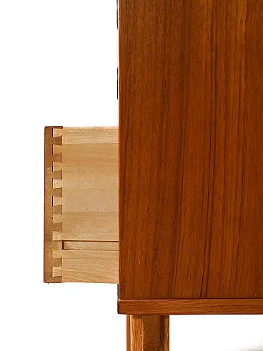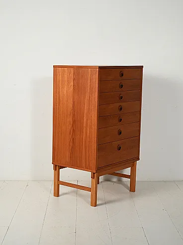 Elegant Scandinavian teak chest of drawers made in the 1960s, characterized by six drawers of different heights which guarantee maximum versatility. The round carved handles and thin legs highlight the formal cleanliness of the Nordic design. The first drawer retains the original divider for cutlery, a rare detail that testifies to the artisanal quality of the piece.