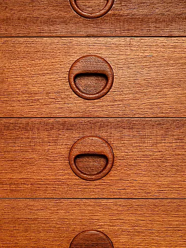 Scandinavian teak chest of drawers with six drawers of different heights and round carved handles, 1960s.