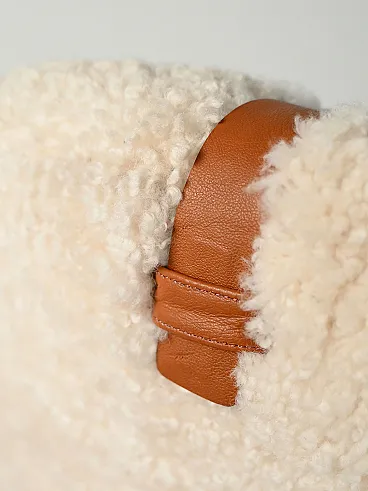 “Safir” armchair designed by Hans Olsen for Göte Möbler, with teak base, padded structure and sheepskin covering.