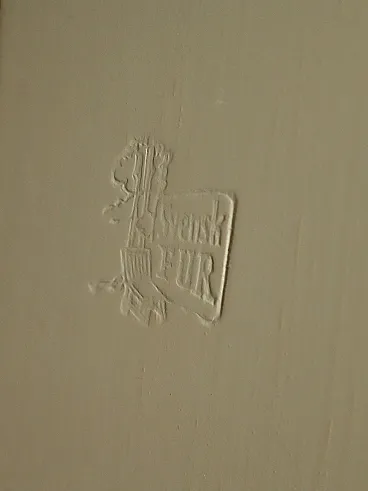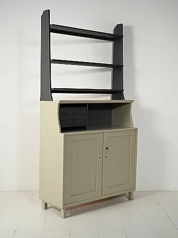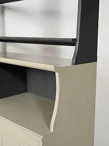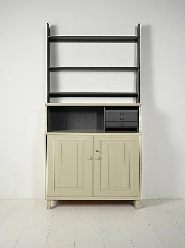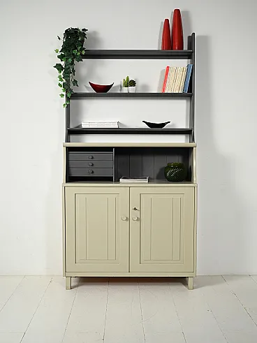 Cabinet with exposed shelves from the “Visingsö” series, designed by Carl Malmsten for Svensk Fur, Swedish production from the 1950s. Solid wood structure with hinged doors and internal shelves, intermediate shelf with document holder and upper part with open shelves. The original beige and anthracite gray lacquering highlights the sobriety of the Nordic design, inspired by popular tradition reinterpreted in an elegant key.