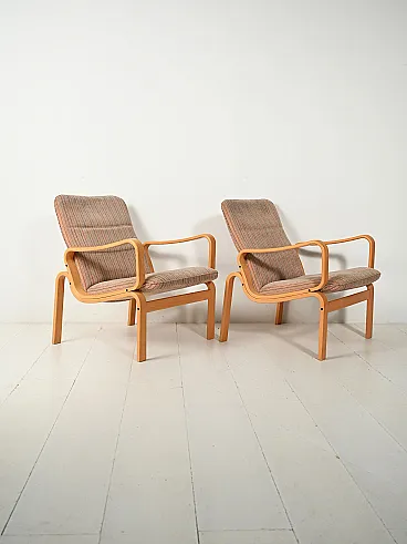Elegant pair of Scandinavian armchairs produced by Ire Möbler in the 1960s, made of bent beech with the typical Nordic craftsmanship in woodworking. The harmonious and timeless design makes them iconic representatives of mid-century modern style. The original padding is well preserved, while the striped velvet upholstery on a beige base shows some signs of wear, consistent with the age of the piece.